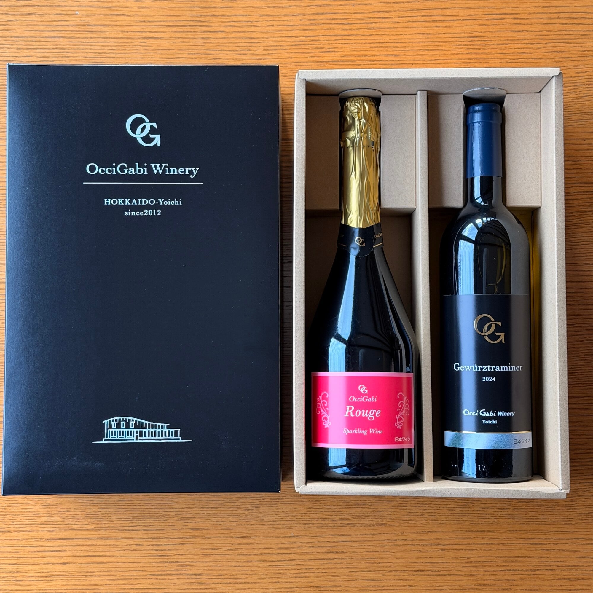真っ赤な「ルージュ・スパークリング」と、香り高い白ワイン「ゲヴュルツトラミナー」がセットになったギフトボックスです。